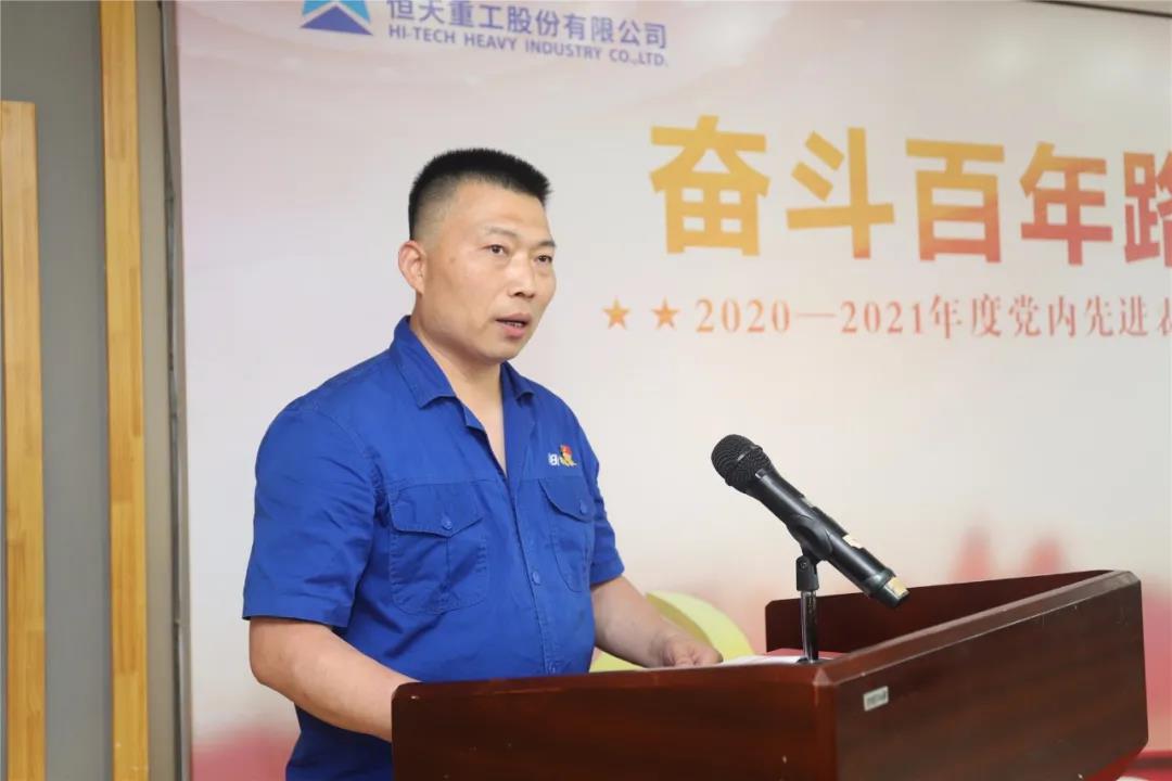 大會在莊嚴肅穆的國歌聲中拉開序幕。公司黨委副書記呂宏斌宣讀了《關于2020—2021年度黨內先進集體和先進個人的表彰決定》,公司總部非織造布事業部黨總支等10個基層黨組織獲得公司“先進基層黨組織”稱號,技術開發黨總支開發黨支部等26個黨支部獲得公司“先進黨支部”稱號,資產管理部職能黨小組等4個黨小組獲得公司“先進黨小組”稱號,加工事業部黨總支高元鵬等15名同志獲得公司“優秀共產黨員標兵”稱號,化纖事業部計劃經營部黨支部劉燁等48名同志獲得公司“優秀共產黨員”稱號,邵陽紡機加工事業部黨總支書記陳燕飛等35名同志獲得公司“優秀黨務工作者”稱號,總部織造事業部路明德等35名同志獲得公司“黨建工作積極分子”稱號。與會領導為先進基層黨組織和共產黨員標兵分別頒發了榮譽證書、獎杯和獎牌。黨員標兵代表、邵陽紡機化纖裝備事業部李紅軍,先進基層黨組織代表、總部加工事業部黨總支書記劉國志分別作了交流發言。