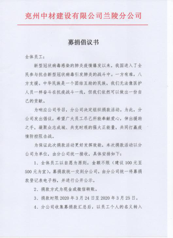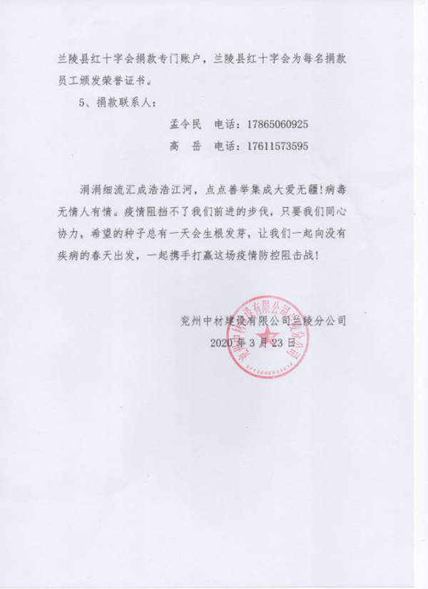 陽(yáng)春三月,乍暖還寒。全國(guó)疫情防控工作取得重大勝果接近尾聲之際,仍有很多人士奮斗在抗疫第一線。災(zāi)害無(wú)情,人間有愛,近日來(lái),蘭陵分公司積極響應(yīng)公司號(hào)召,組織開展為防控新冠肺炎疫情捐款活動(dòng),助力新冠肺炎疫情防控工作。   蘭陵分公司下發(fā)了《募捐倡議書》,堅(jiān)持自覺自愿與量力而行的原則,呼吁全體員工積極參與,奉獻(xiàn)愛心,捐款助力抗擊疫情。分公司經(jīng)理龔士朋同志帶頭捐款,以實(shí)際行動(dòng)做表率,起到很好的模范作用。在龔經(jīng)理的帶動(dòng)下,分公司全體員工積極響應(yīng),紛紛捐款,每一名員工都獻(xiàn)出一份愛心。  經(jīng)過(guò)幾日的募捐,蘭陵分公司共籌集善款8000余元。3月25日,分公司安環(huán)科長(zhǎng)孟令民同志,代表分公司將所籌善款轉(zhuǎn)交蘭陵縣紅十字會(huì)。紅十字會(huì)工作人員表示會(huì)將善款上交省紅十字會(huì),全部用于新冠病毒疫情防控工作。并對(duì)捐款表示十分感謝,對(duì)此崇高的人道主義精神和奉獻(xiàn)愛心的善舉,表示誠(chéng)摯的敬意。最后頒發(fā)給捐贈(zèng)者榮譽(yù)證書。 涓涓細(xì)流匯成浩浩江河,點(diǎn)點(diǎn)善舉集成大愛無(wú)疆!病毒無(wú)情人有情。疫情阻擋不了我們前進(jìn)的步伐,只要我們同心協(xié)力,希望的種子總有一天會(huì)生根發(fā)芽,讓我們一起向沒有疾病的春天出發(fā),一起攜手打贏這場(chǎng)疫情防控阻擊戰(zhàn)! |