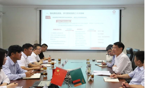 1月20日上午,蔣中文向中材礦山、蘇州中材、中材建設、智慧工業等在贊比亞團隊講授主題為“自信自立、守正創新、勇擔國際化發展前沿重任”的黨課,并提出以下要求:一是強化理論武裝,充分學習貫徹黨的二十大精神。二是牢固樹立戰略思維,確保中材國際發展戰略在贊比亞有效落實。三是堅持立足屬地發展,接續公司國際化發展偉大事業。