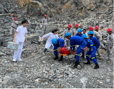 演練開始,總指揮張鵬收到現(xiàn)場有發(fā)生塊石滾落,造成現(xiàn)場技術員腿部受傷請求救援的緊急報告,立即下達指令啟動分公司應急預案,并對本次救援進行全面組織部署,對分公司警戒保衛(wèi)組、搶先救援組、醫(yī)療救護組、通訊聯(lián)絡組等下達指令,各小組在接到指令后立即響應應急預案,第一時間到達事故發(fā)生地,按秩序組織搶險救援,對傷員進行緊急救治并對事故發(fā)生地進行警戒隔離。