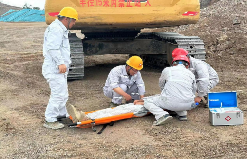 本次演練主要模擬515平臺發(fā)生車輛傷害事故,一名員工被挖機(jī)回轉(zhuǎn)時碰傷倒地,頭部撞擊受傷,傷情嚴(yán)重,進(jìn)行緊急救援的情景。